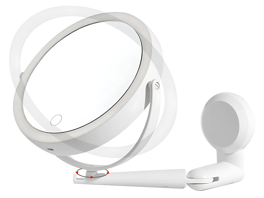 Elastīgā roka un par 360° grozāmā galviņa ļauj pilnībā pielāgot spoguļa novietojumu jūsu vajadzībām. To var pagriezt gan horizontāli, gan vertikāli, un pēc lietošanas ērti salocīt pie sienas, tādējādi ietaupot vietu.