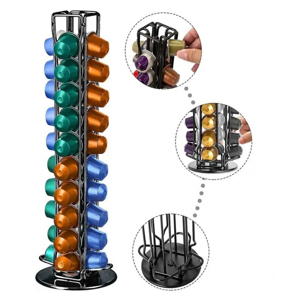 Elegants un praktisks rotējošs statīvs, kas paredzēts ērtai Nespresso sistēmas kafijas kapsulu uzglabāšanai. Tas ļauj gaumīgi sakārtot līdz pat 40 kapsulām, padarot tās viegli pieejamas ikdienas lietošanai.