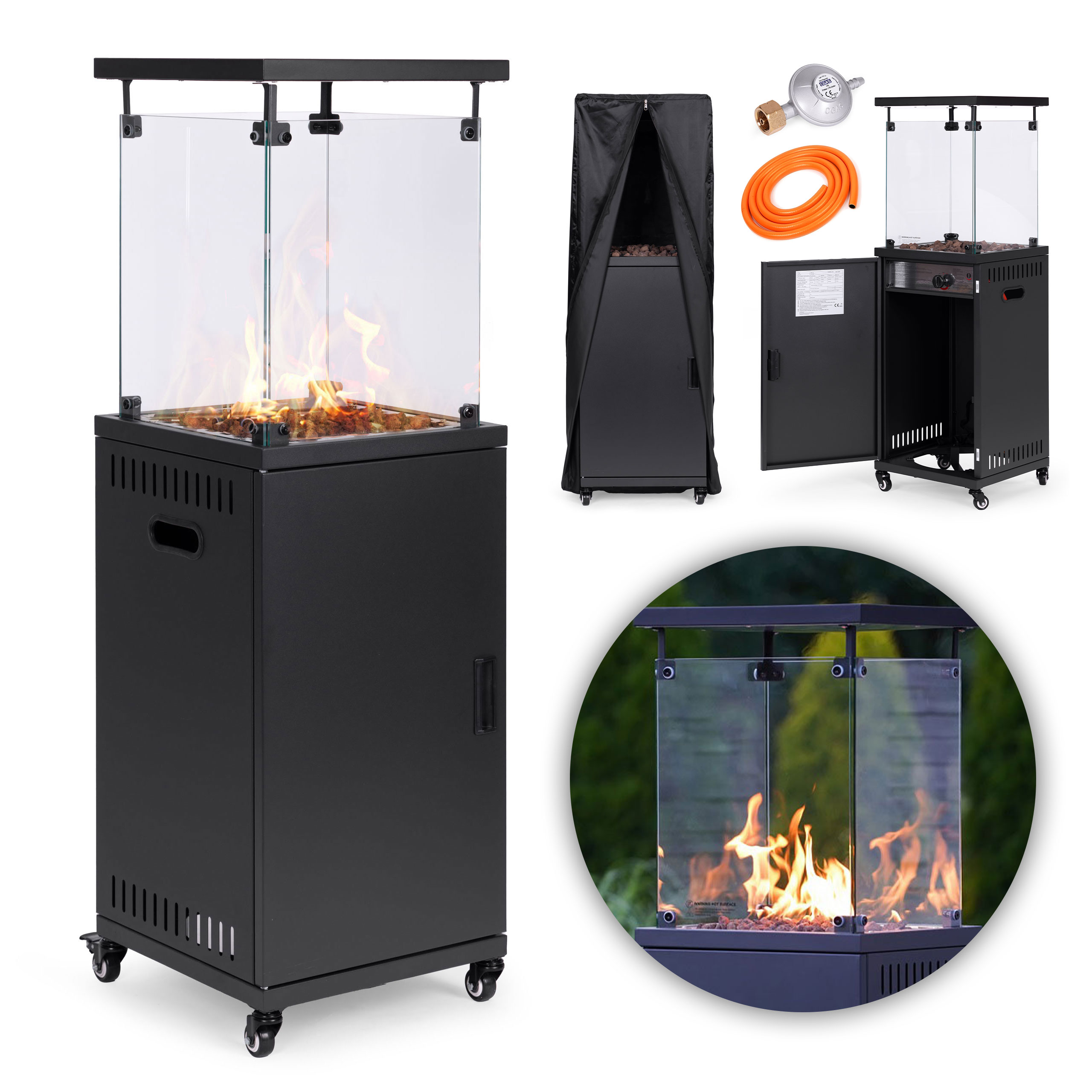 - Includes: Gas patio heater, volcanic rocks, hose & regulator, protective cover