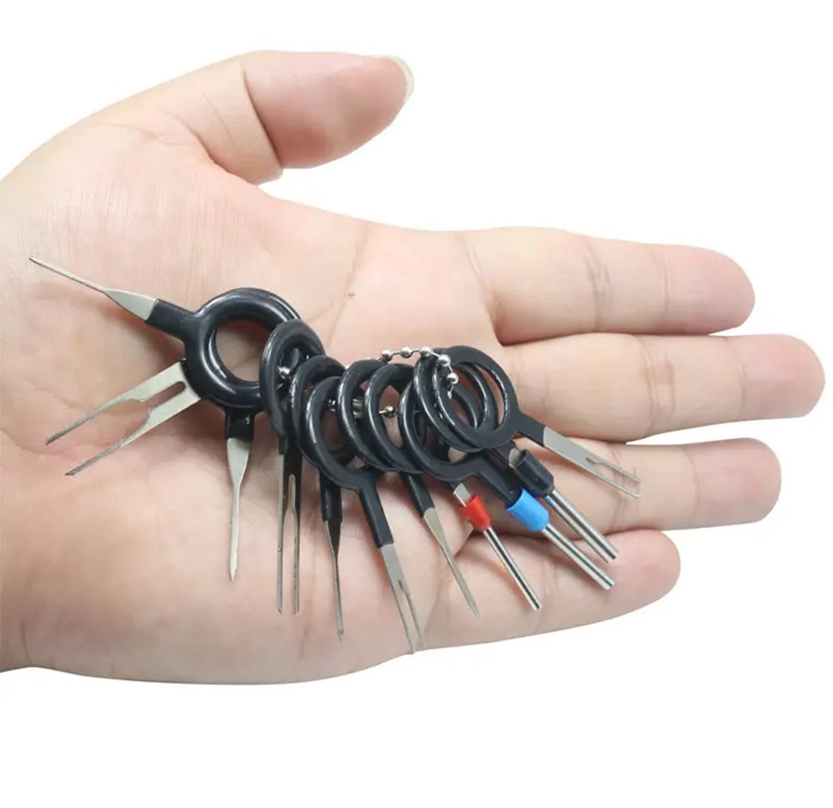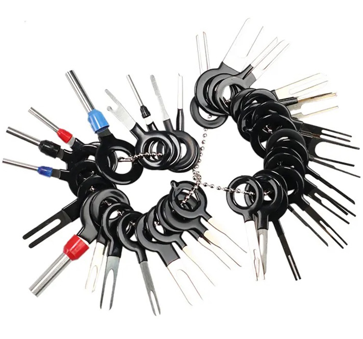 Universāls komplekts ar 38 tapu noņemšanas mehānismiem (savienotājiem). Komplektā ir 4 veidu atslēgas (vienkāršas, dubultas, cauruļveida un trīskāršas) dažādiem diametriem. Tās ideāli piemērotas elektroinstalācijas kluču remontam. Nepieciešams ikvienam, kas remontē automobiļu vai datortehniku.
