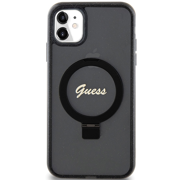 Guess iPhone 11 / Xr vāciņš Ring Stand Script Glitter MagSafe, melns