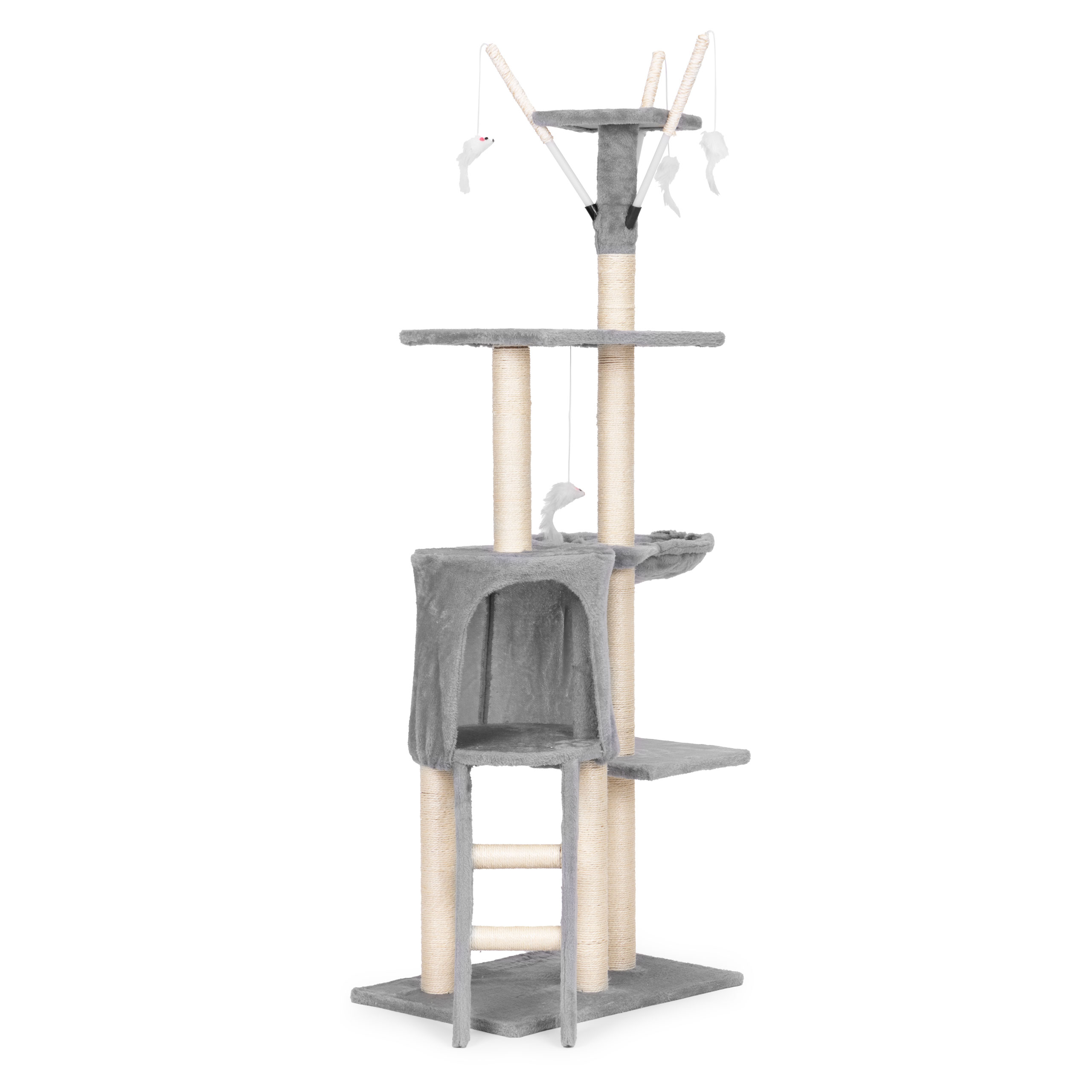 Petsi kaķu skrāpējamais koks ir daudzfunkcionāls aktivitāšu centrs, kas apmierina visas kaķa dabiskās vajadzības – no nagu asināšanas un kāpelēšanas līdz pat atpūtai. Pateicoties pārdomātajai piecu līmeņu konstrukcijai, jūsu kaķis varēs droši izlādēt enerģiju, asināt nagus uz izturīgajiem sizala stabiem vai vērot apkārtni no augstajām platformām. Iebūvētā mājiņa ar mīkstu guļvietu rada ideālu vietu snaudai un mieram. Šis kaķu koks lieliski iederēsies jebkurā interjerā, piedāvājot jūsu mīlulim privātu atpūtas zonu un ikdienas aktivitātes.