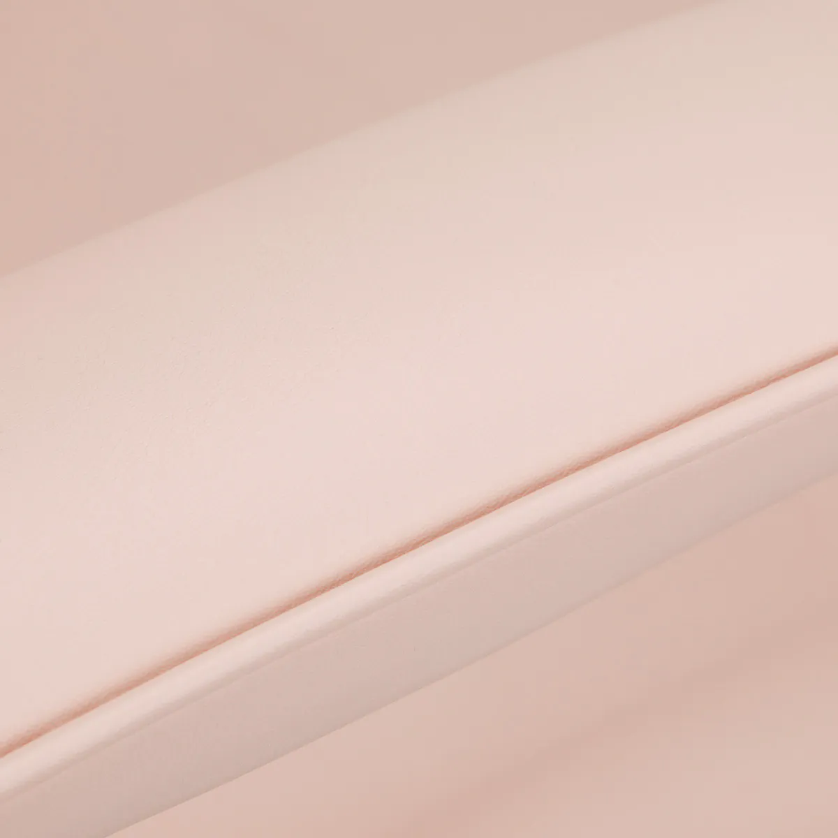 Apdare ir izgatavota no pusmatētas eko ādas maigi rozā tonī. Materiāls ir izturīgs pret mitrumu, viegli kopjams un saglabā pievilcīgu izskatu pat intensīvas lietošanas laikā. Krēsls ir aprīkots ar optimālas blīvuma mīkstu pildījumu un ergonomisku formu maksimālam komfortam.