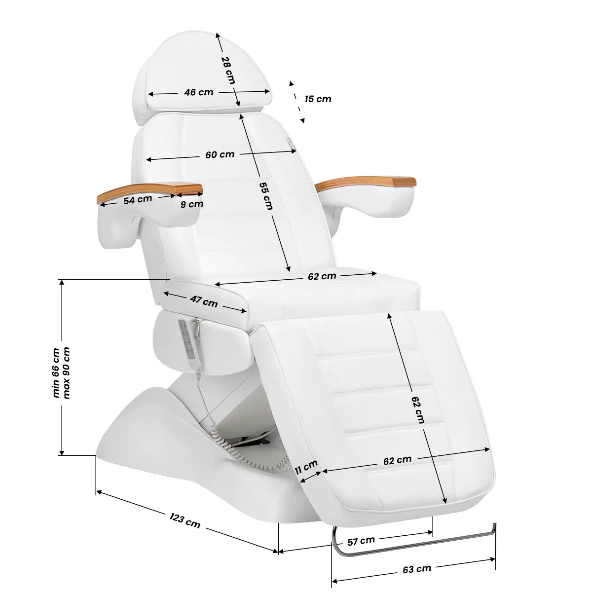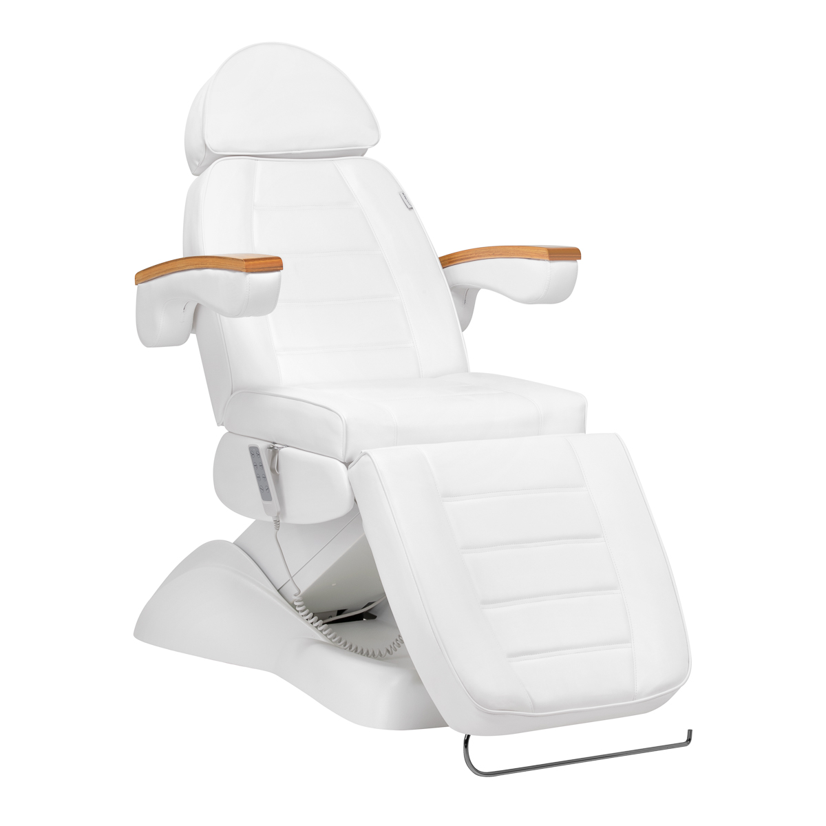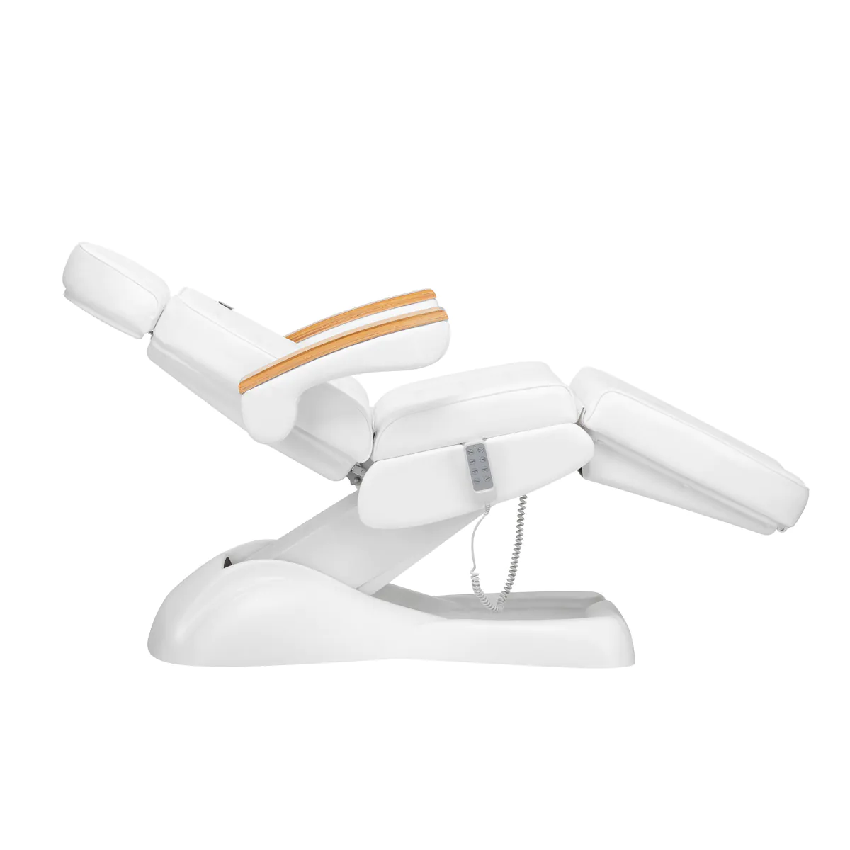 Krēsls ir piepildīts ar putām, kurām ir optimāla cietība, un tā virsma ir pārklāta ar patīkamu mākslīgās ādas materiālu baltās krāsas toņos. Materiāls ir viegli tīrāms un izturīgs pret izvēlētiem dezinfekcijas līdzekļiem, kas nodrošina komfortu lietošanā un ilgstošu izturību pret mitrumu. Cieta pamatne, kas izgatavota no izturīga materiāla baltās krāsas toņos, nodrošina stabilitāti procedūru laikā. Dekoratīvie koka elementi uz roku balstiem piešķir krēslam elegantu izskatu, kas piesaista uzmanību. Rūpīgi izstrādāti, ergonomiski šuvējumi piešķir krēslam stilīgu izskatu, vienlaikus nodrošinot komfortu.