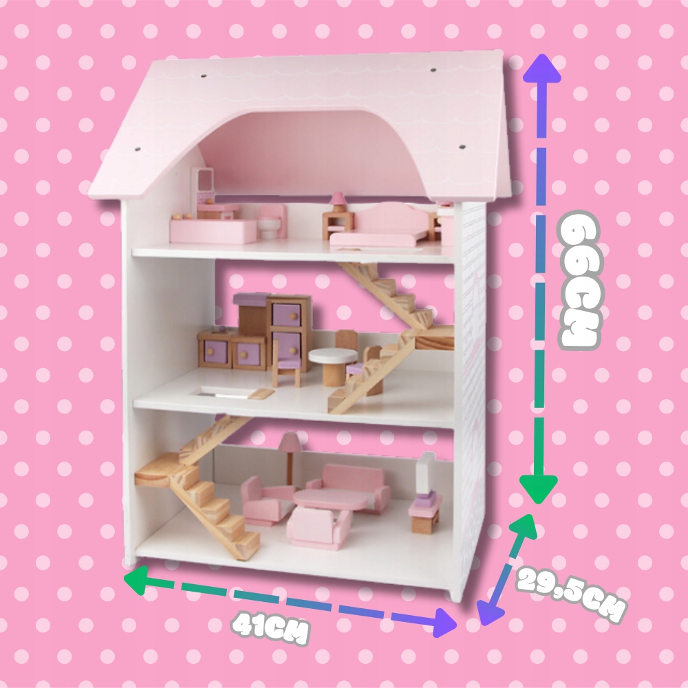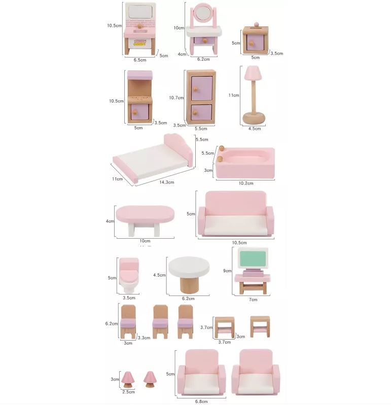 Komplektā ietilpst trīsstāvu māja ar kāpnēm un plašs mēbeļu klāsts: gulta, virtuve, dīvāns, vannas istabas aprīkojums, galdi, krēsli un pat mazas lampiņas.