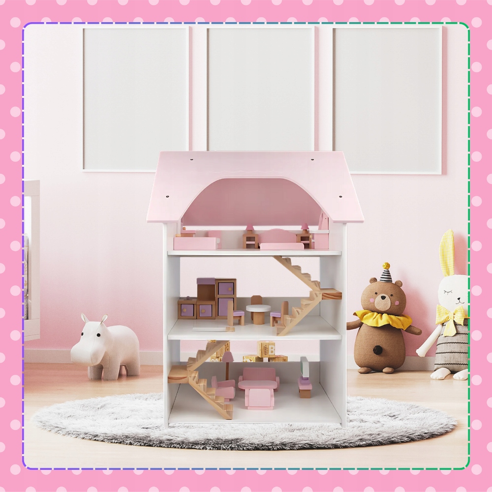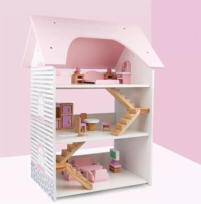 Bakalu liela koka leļļu māja ar 3 stāviem un mēbelēm