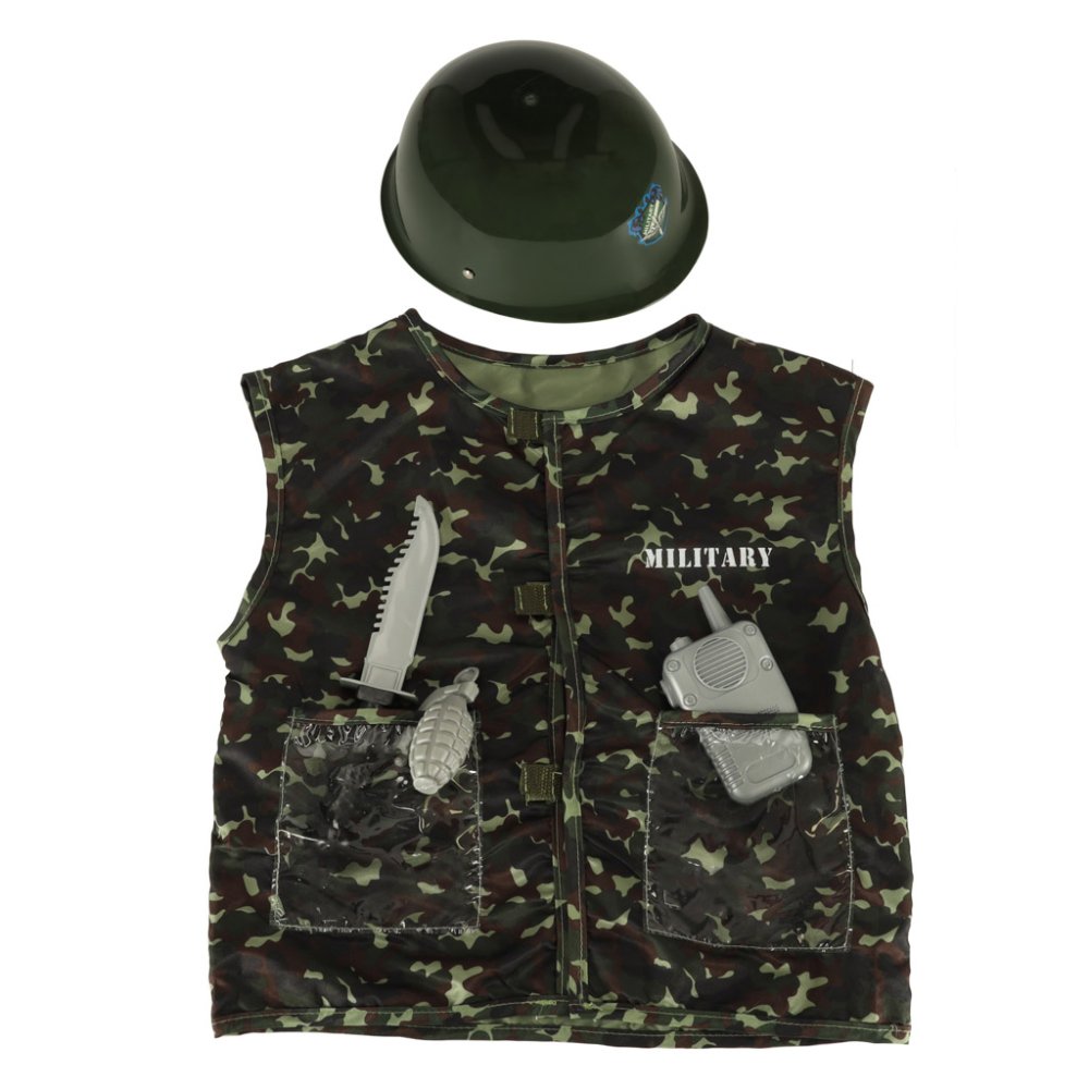 Komplektā ietilpst maskēšanās veste ar divām kabatām, ķivere ar regulējamu siksnu, plastmasas nazis, plastmasas granāta un rotaļu rācija.