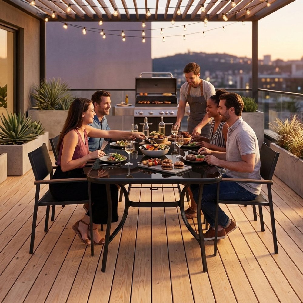Galda virsma ir izgatavota no augstas kvalitātes rūdīta stikla, kas ir īpaši izturīgs pret mainīgiem laikapstākļiem un ikdienas mehāniskiem bojājumiem. Melnais rāmis ne tikai piešķir elegantu izskatu, bet arī droši aizsargā galda malas no triecieniem. Galda kājas ir izgatavotas no izturīga pulverkrāsota tērauda, kas efektīvi pasargā konstrukciju no mitruma un korozijas ilgtermiņā. Neslīdošie paliktņi nodrošina izcilu stabilitāti uz jebkuras virsmas un aizsargā jūsu terases grīdu no skrāpējumiem.