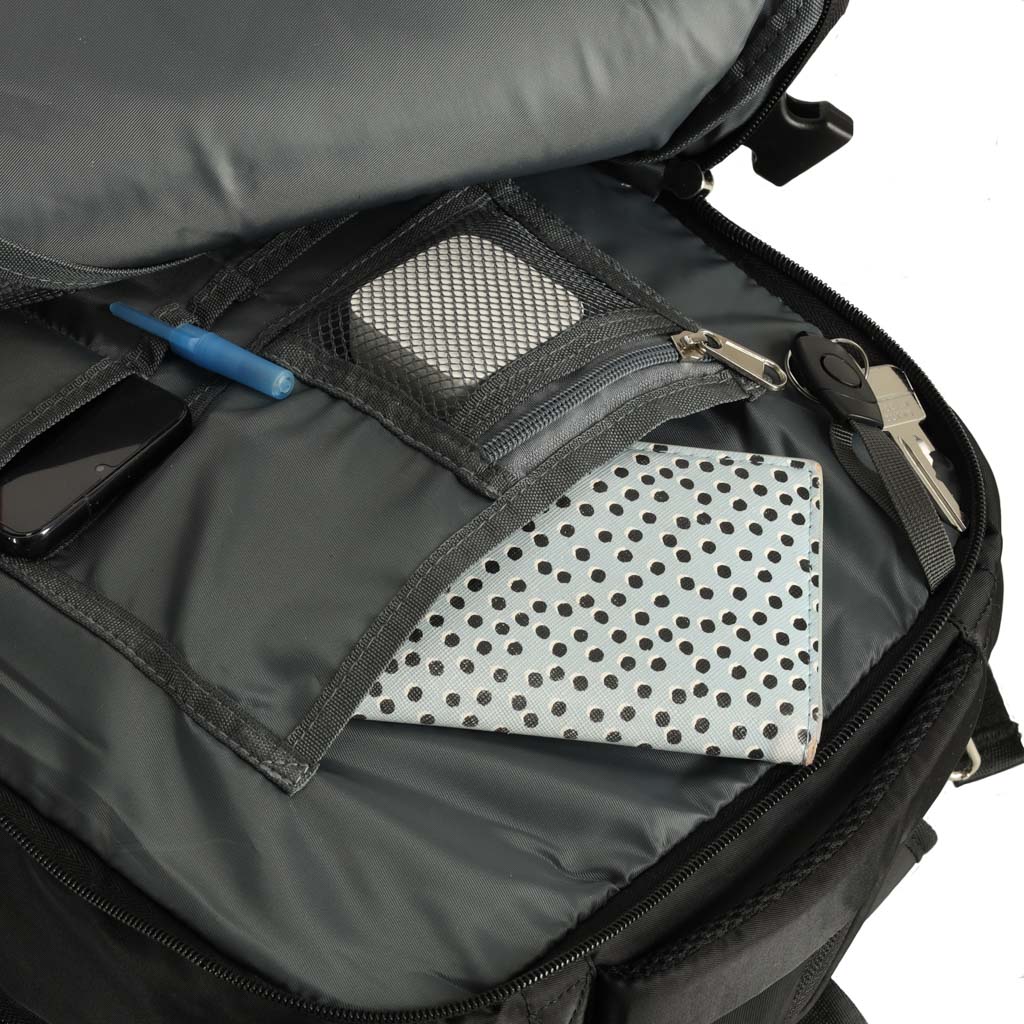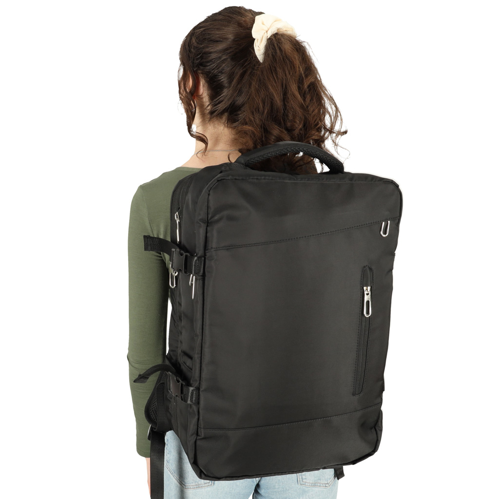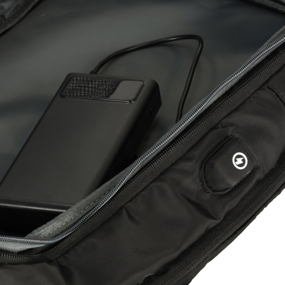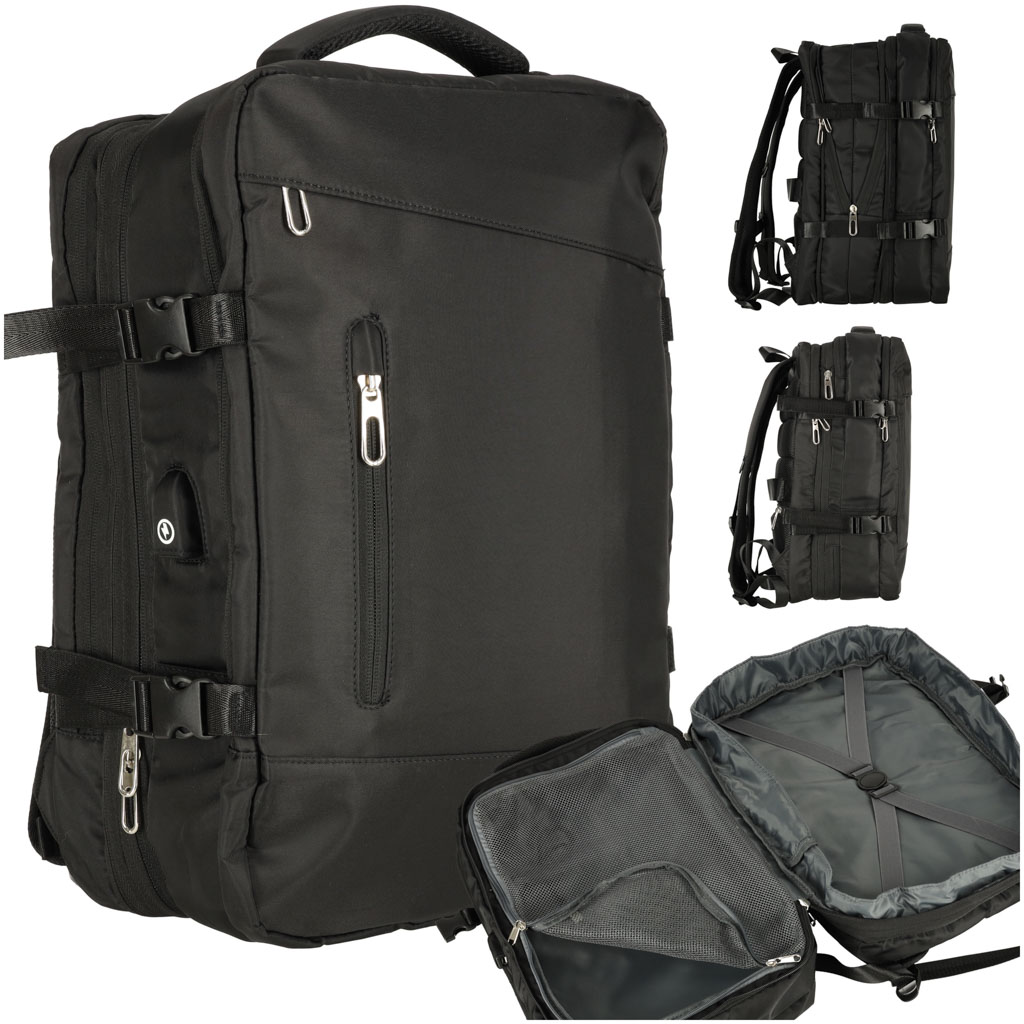 Melna, ūdensizturīga ceļojumu mugursoma. Mugursomas galvenā kabata ir veidota, ņemot vērā funkcionalitāti, un tajā ir siets un drošības lencēm, piemēram, koferī. Turklāt mugursoma izplešas plakaniski. Iespēja paplašināt mugursomu par 10 centimetriem ļauj iesaiņot vairāk priekšmetu. Tas būs lieliski piemērots gan ceļošanai, gan ikdienas lietošanai. Tam ir USB ligzda un USB kabelis, kas ļauj uzlādēt tālruni, neizņemot barošanas bloku.
