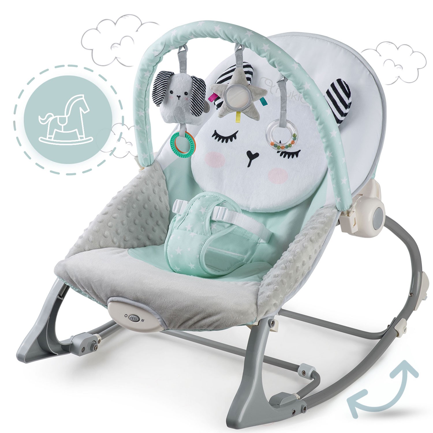 Šūpuļkrēsliņš ir aprīkots ar noņemamu loku, kuram piestiprinātas čaukstošas rotaļlietas. Tās nodrošinās Jūsu bērnam izklaidi, kamēr Jūs varēsiet atpūsties. Šīs unikālās rotaļlietas stimulē redzi un attīsta taustes maņu.