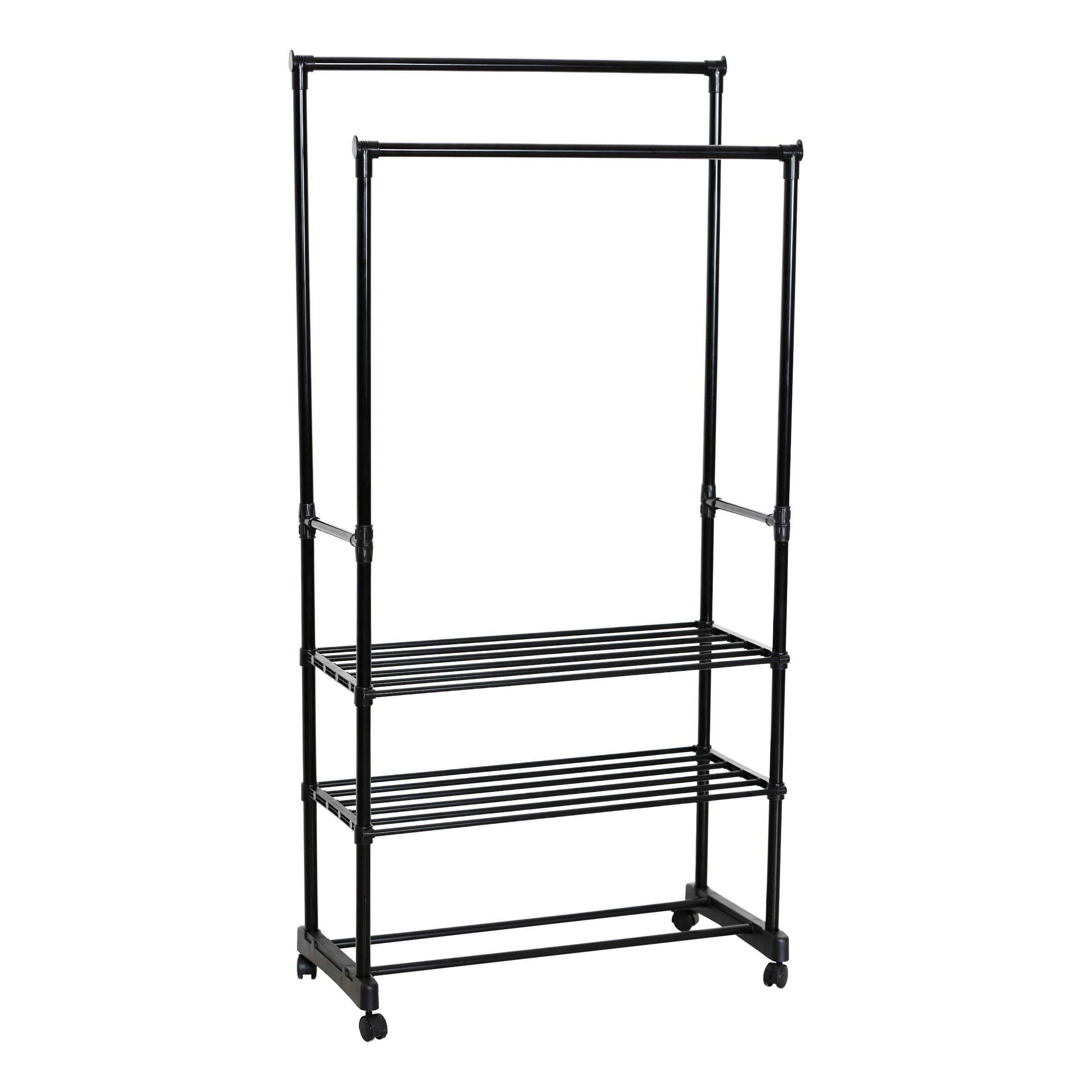 Ieviesiet kārtību un stilu savā mājoklī ar šo praktisko metāla drēbju statīvu. Aprīkots ar stangu drēbju pakarināšanai un trīs ietilpīgiem plauktiem, tas ir ideāls risinājums apģērbu, apavu un aksesuāru uzglabāšanai vienuviet, uzturot jūsu telpu sakārtotu.