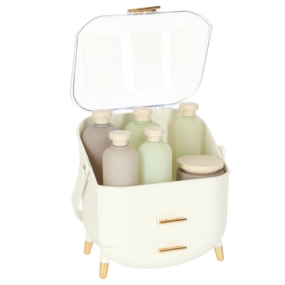 Šis kosmētikas konteiners ir izstrādāts cilvēkiem, kuri vēlas, lai visi kosmētikas piederumi būtu pa rokai un ideālā kārtībā. Pateicoties caurspīdīgajam vākam un divām atvilktnēm, jūs varat ērti uzglabāt gan vannasistabas kosmētiku, gan rotaslietas, otas, krēmus vai citus sīkumus.