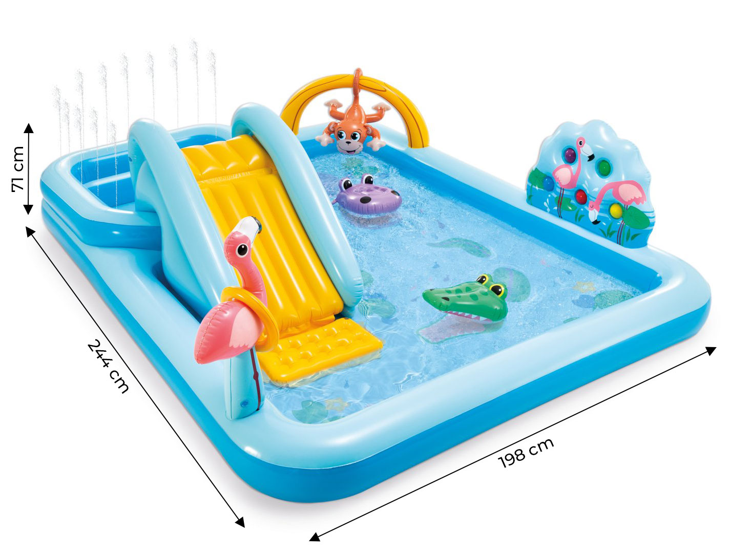 Pārvērtiet savu dārzu par džungļu oāzi ar INTEX 57161 piepūšamo ūdens rotaļu laukumu. Šis krāsainais bērnu baseins ar slidkalniņu un strūklaku nodrošinās stundām ilgu jautrību un atvēsinājumu karstās vasaras dienās. Tas ir ideāli piemērots bērniem no 2 gadu vecuma, kuriem patīk ūdens, kustība un jautras krāsas.