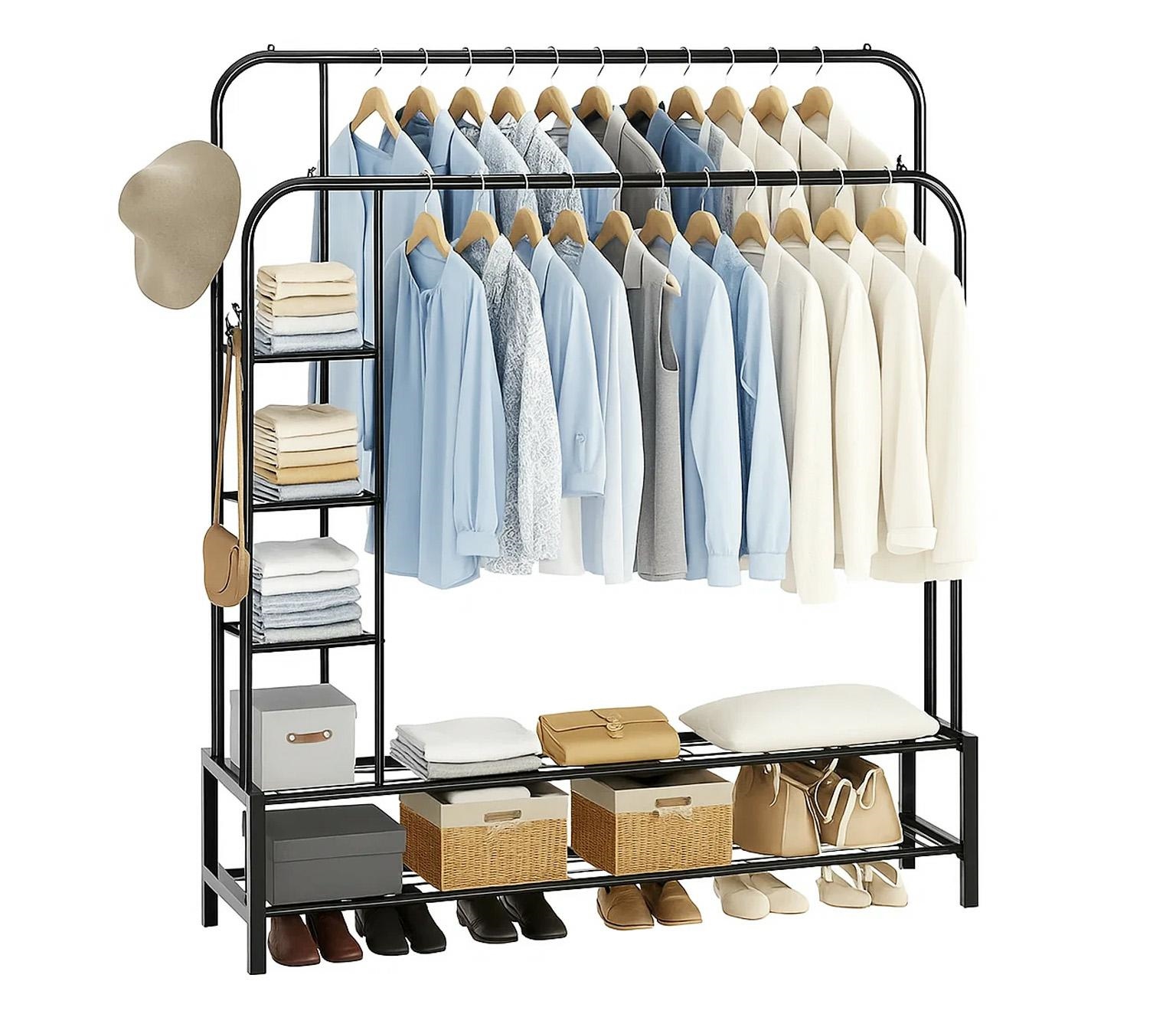 Dubultais drēbju statīvs ar 5 plauktiem un āķiem
