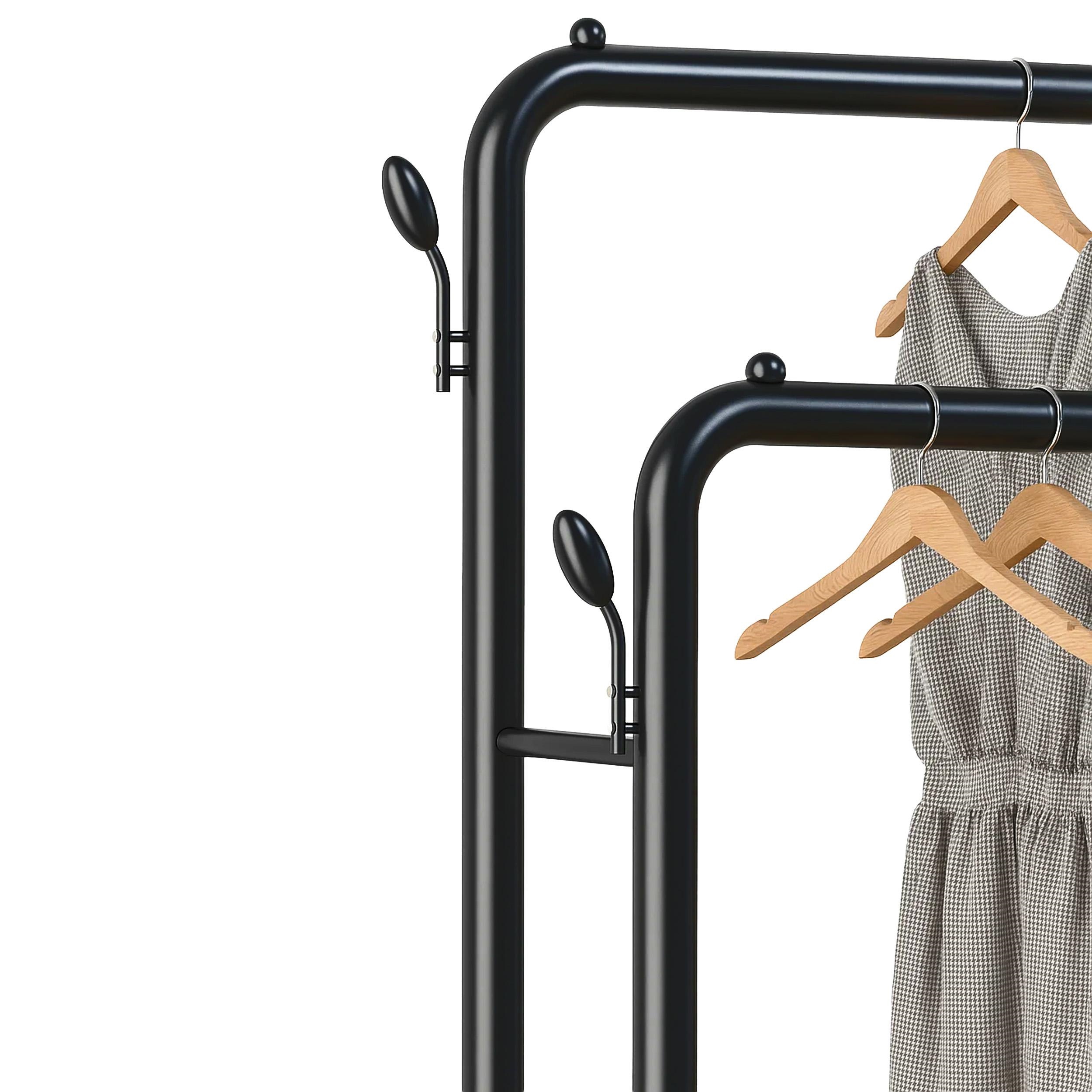 Ieviesiet kārtību savā telpā ar šo izturīgo dubulto drēbju statīvu. Tā stabilā tērauda konstrukcija, divi stieņi, pieci plaukti un sānu āķi nodrošina plašu vietu drēbēm, apaviem un aksesuāriem, palīdzot uzturēt mājokli sakārtotu.