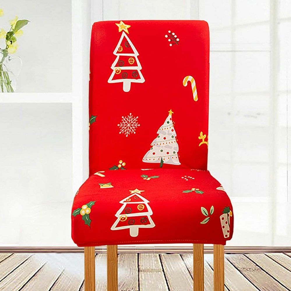 Эластичный новогодний чехол на стул с елками, красный
