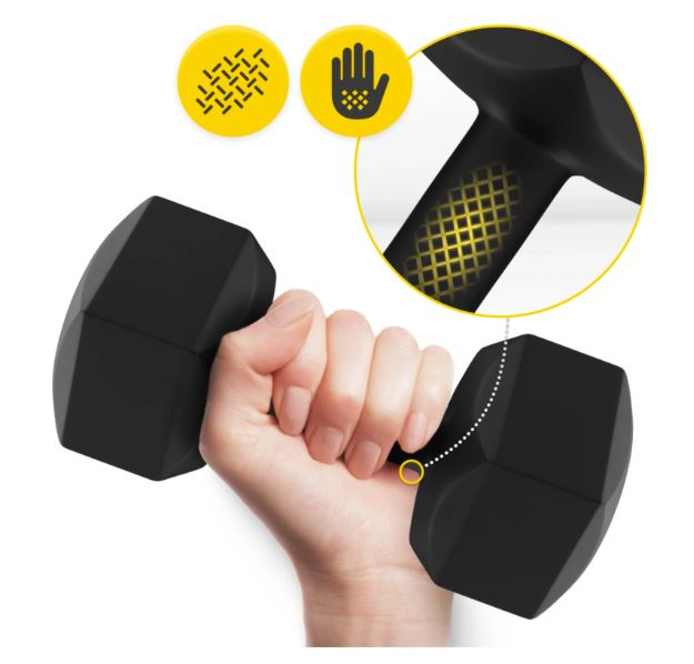 - Шестиугольная форма: предотвращает перекатывание гантелей по полу, повышая безопасность.