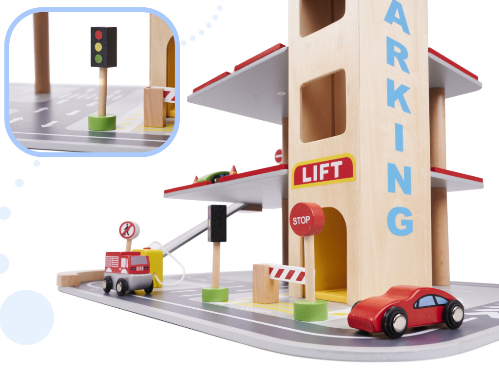 Красивый деревянный городской гараж имеет четыре уровня! Первые три предназначены для машинок - здесь найдется место для деревянных машинок, входящих в набор, а также многих других транспортных средств вашего ребенка.