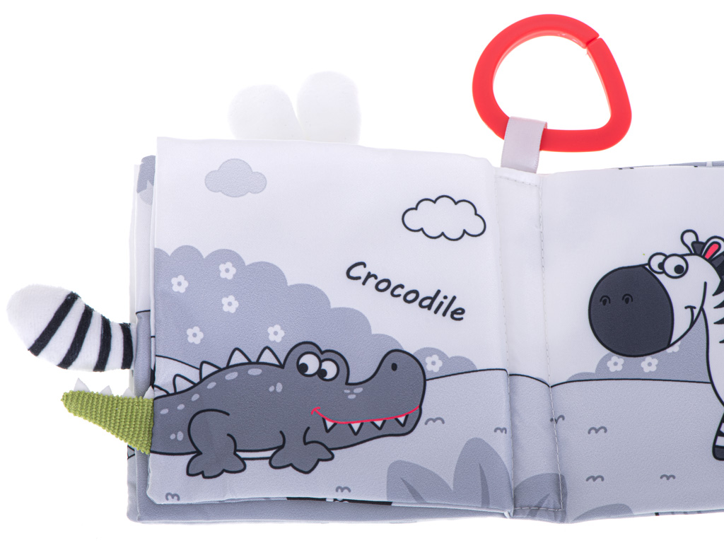 Волшебная книжка из ткани с контрастными узорами — отличный подарок для детей, которые только знакомятся с миром. Книга состоит из 4-х тканевых страниц с изображением различных животных, среди которых вы найдете: сову, обезьяну, панду, слона, кролика, крокодила и зебру.
