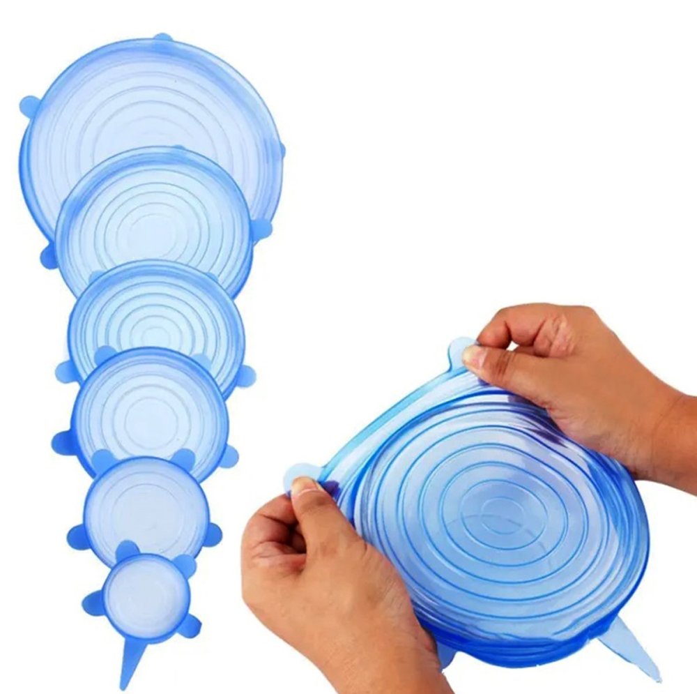 - Набор из 6 силиконовых бесцветных крышек для пищевых продуктов.