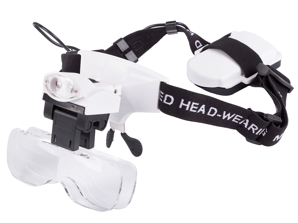 Лупа выполнена в виде очков с регулируемым ремешком, что обеспечивает комфортное использование и свободные руки во время работы. Встроенная светодиодная подсветка и линзы с разным увеличением позволяют адаптировать устройство к конкретной задаче.