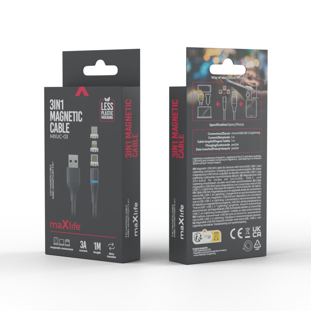 Maxlife MXUC-03 Magnetic USB to Lightning / USB Type C / micro USB Nylon Braided Cable 3A, 1m | Провод для Зарядки Передачи Данных