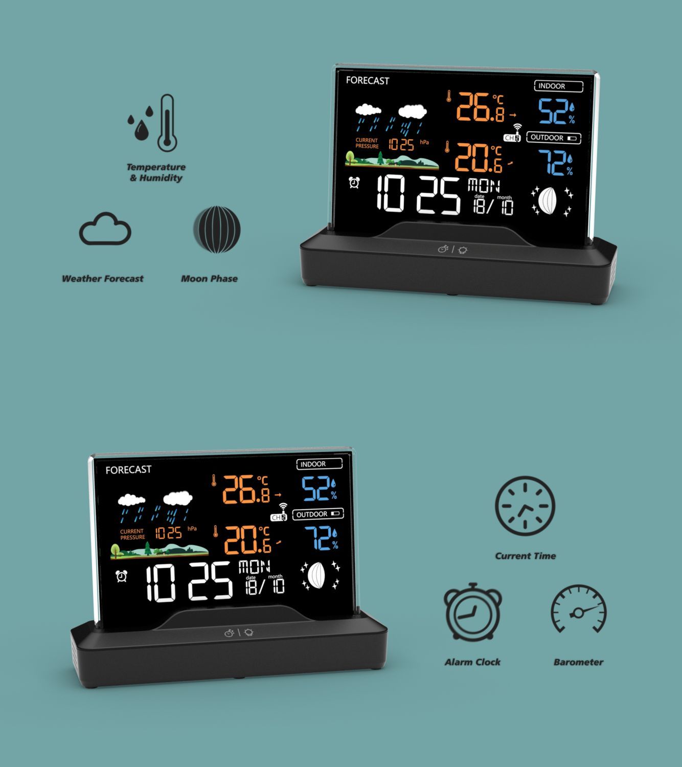 Эта современная беспроводная метеостанция — надежный инструмент для мониторинга погодных условий, который подойдет как для дома, так и для офиса. Станция оснащена радиоуправляемыми часами, которые автоматически синхронизируются с сигналом времени, избавляя от необходимости ручной настройки. Это особенно полезная функция, обеспечивающая всегда точное время, независимо от смены часовых поясов или перехода на летнее и зимнее время. Четкость информации гарантирует большой цветной ЖК-дисплей с возможностью регулировки яркости. Благодаря этому показания отлично видны как днем, так и ночью, что делает станцию идеальным решением для людей любого возраста, включая пожилых.