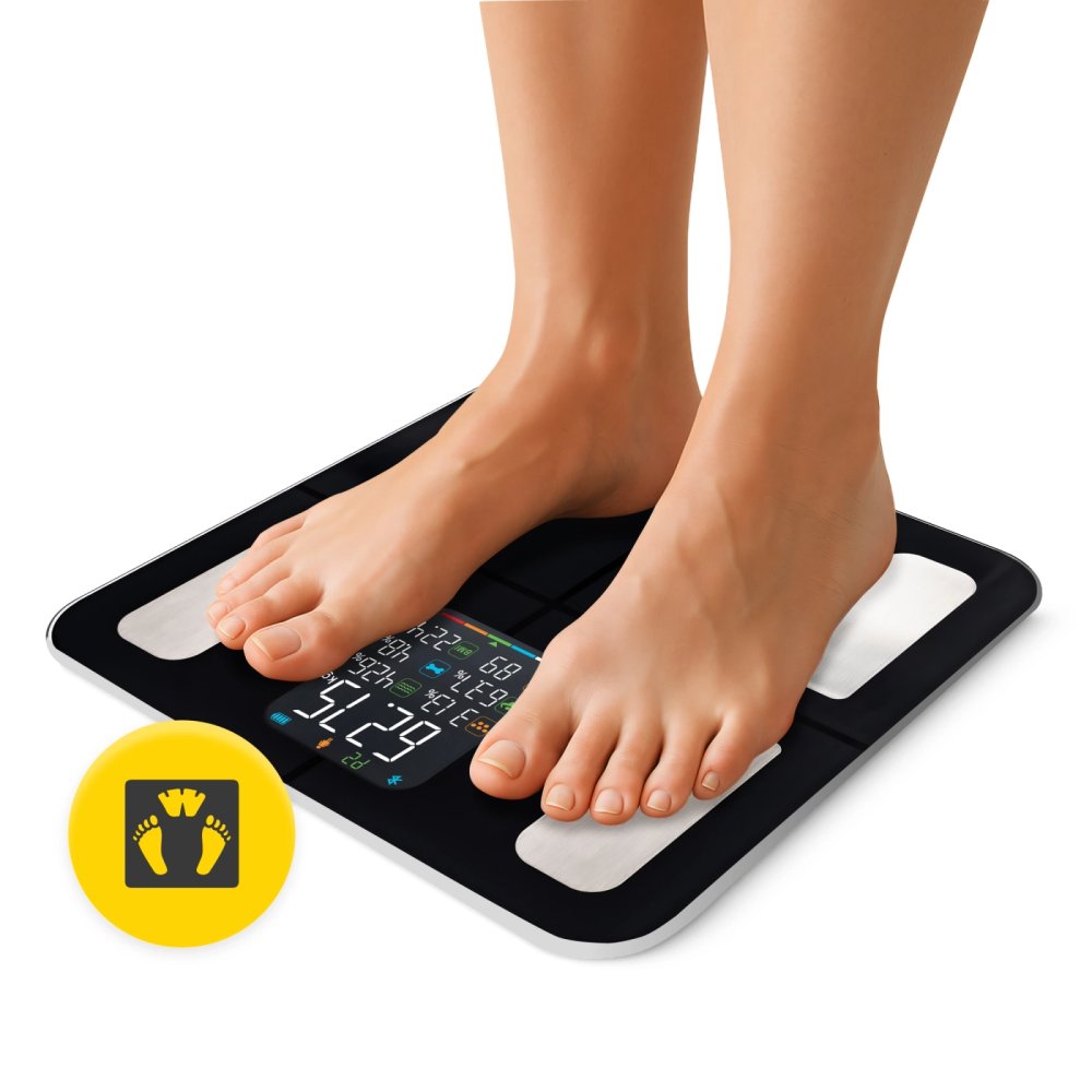 Эти весы предлагают комплексный анализ тела и удобную синхронизацию данных со смартфоном. Большой цветной ЖК-экран позволяет одновременно просматривать несколько показателей, а возможность создания до 10 профилей пользователей делает их идеальными для всей семьи.