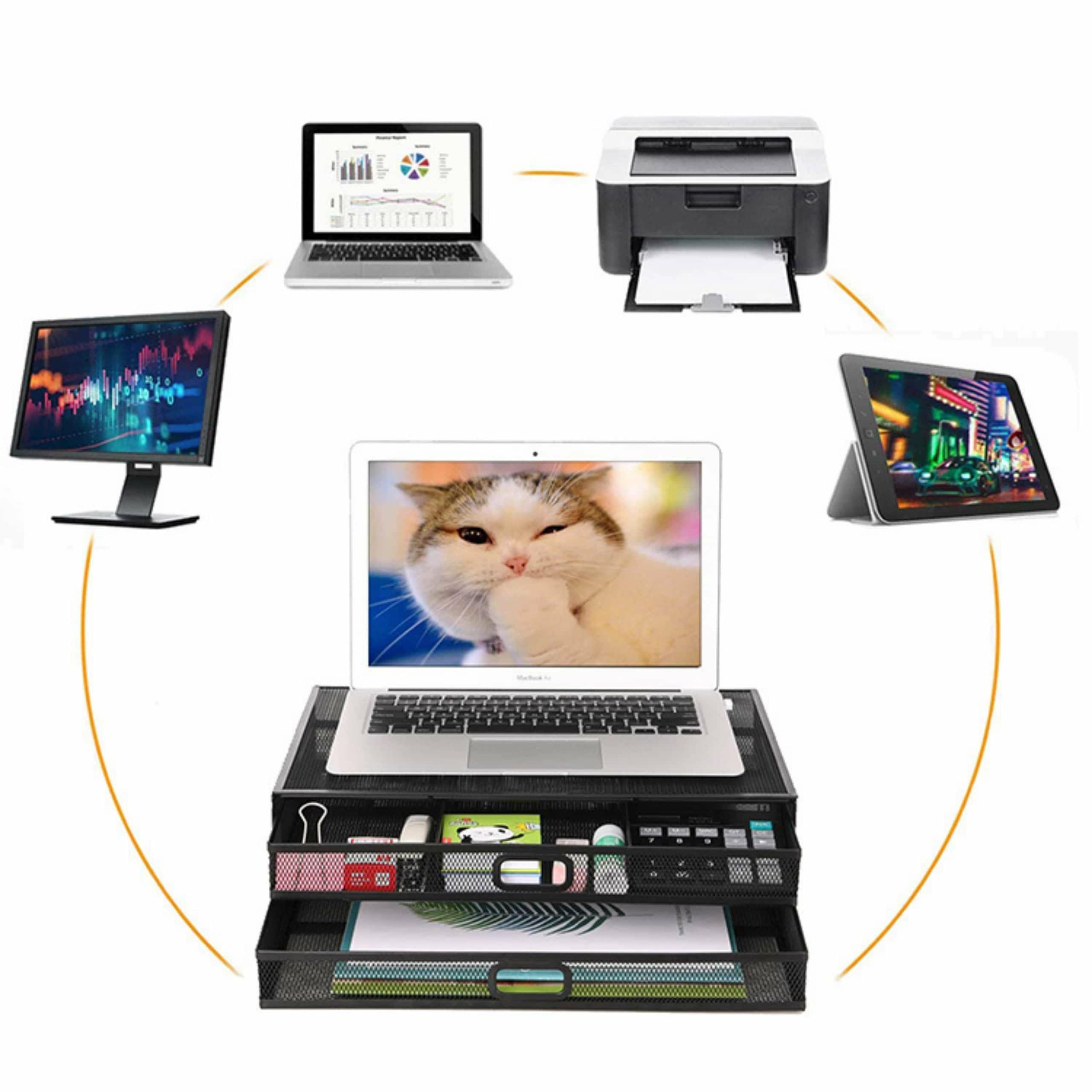 Улучшите эргономику и порядок на своем рабочем столе с помощью этой прочной металлической подставки для монитора с 2 ящиками. Предназначенная для мониторов, ноутбуков или небольших телевизоров, она поднимает экран на комфортную для глаз высоту, помогая уменьшить напряжение в шее и спине. Сетчатая конструкция обеспечивает надлежащую вентиляцию устройств.