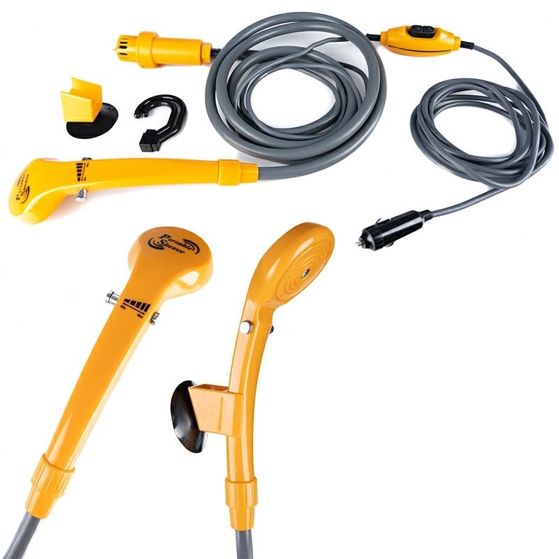 Портативный туристический душ Gotel Q16G с электрическим водяным насосом — это практичное решение для поездок на природу, кемпинга и путешествий на автомобиле. Он работает от автомобильного прикуривателя 12V, обеспечивая комфортное мытье в любом месте.