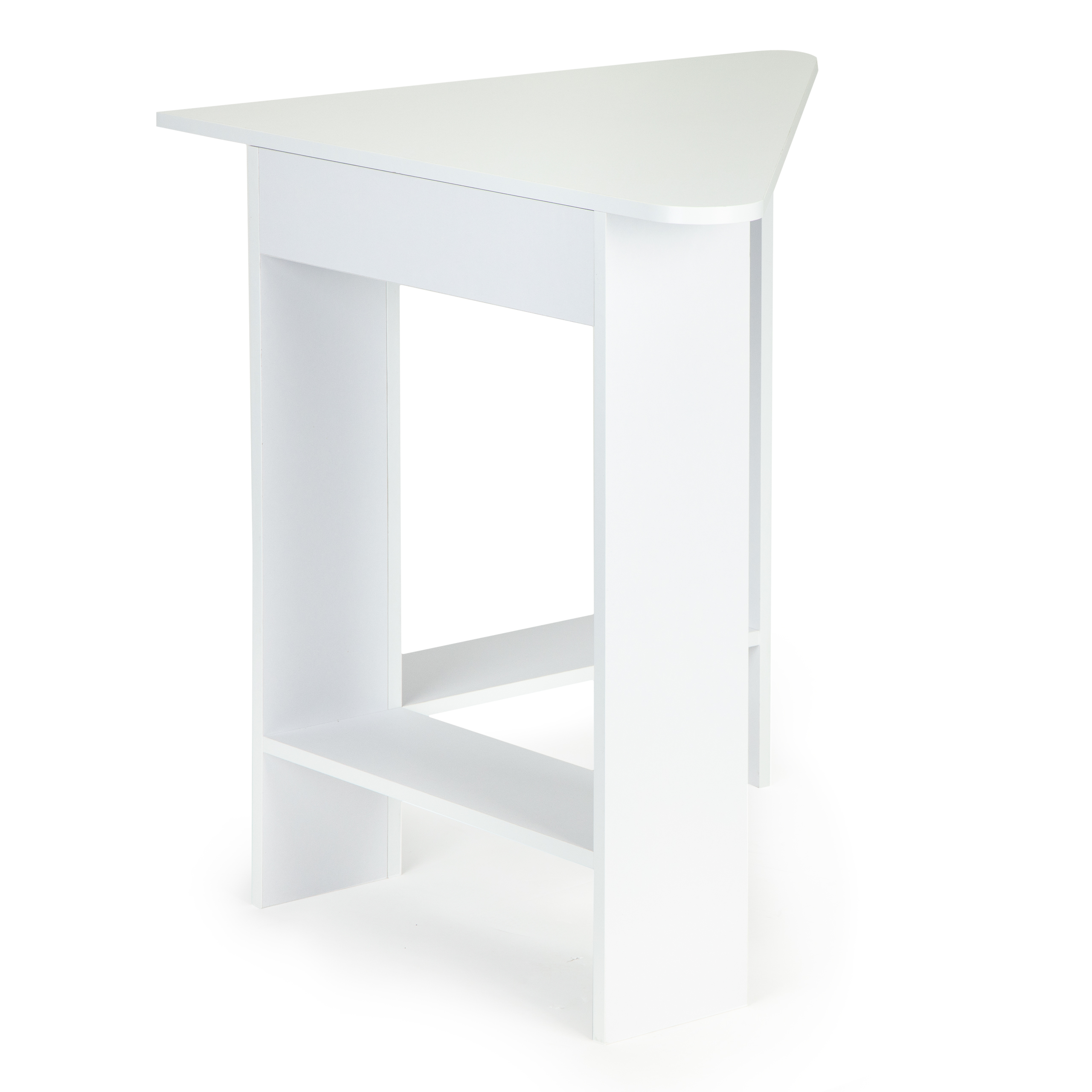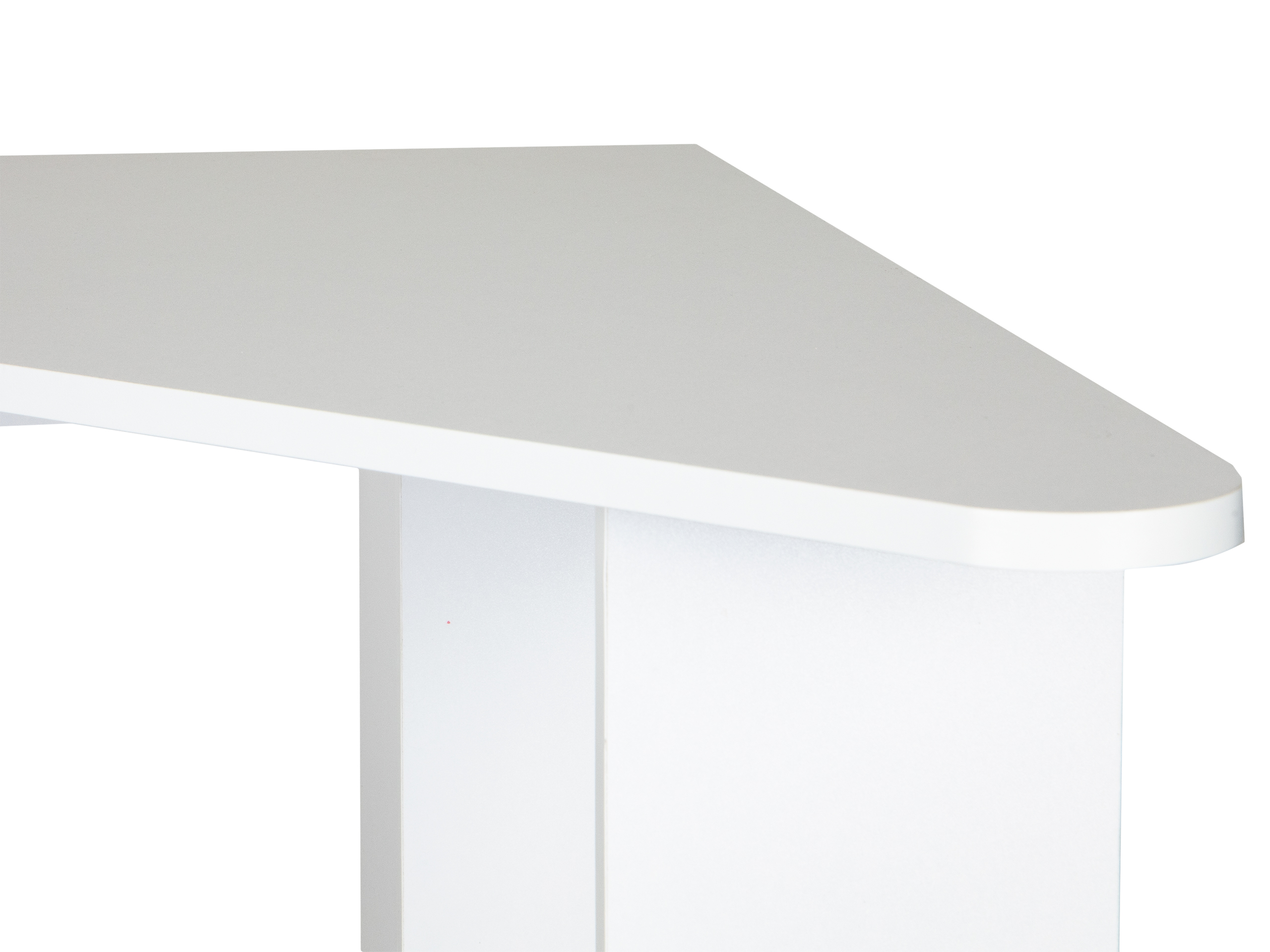 Благодаря своей треугольной форме, этот угловой стол позволяет максимально эффективно использовать пространство в углу комнаты. Это отличное решение для небольших помещений, офисов или приемных, где важен каждый сантиметр. В нижней части стола расположены две вместительные полки, на которых удобно разместить системный блок компьютера, книги или другие принадлежности.
