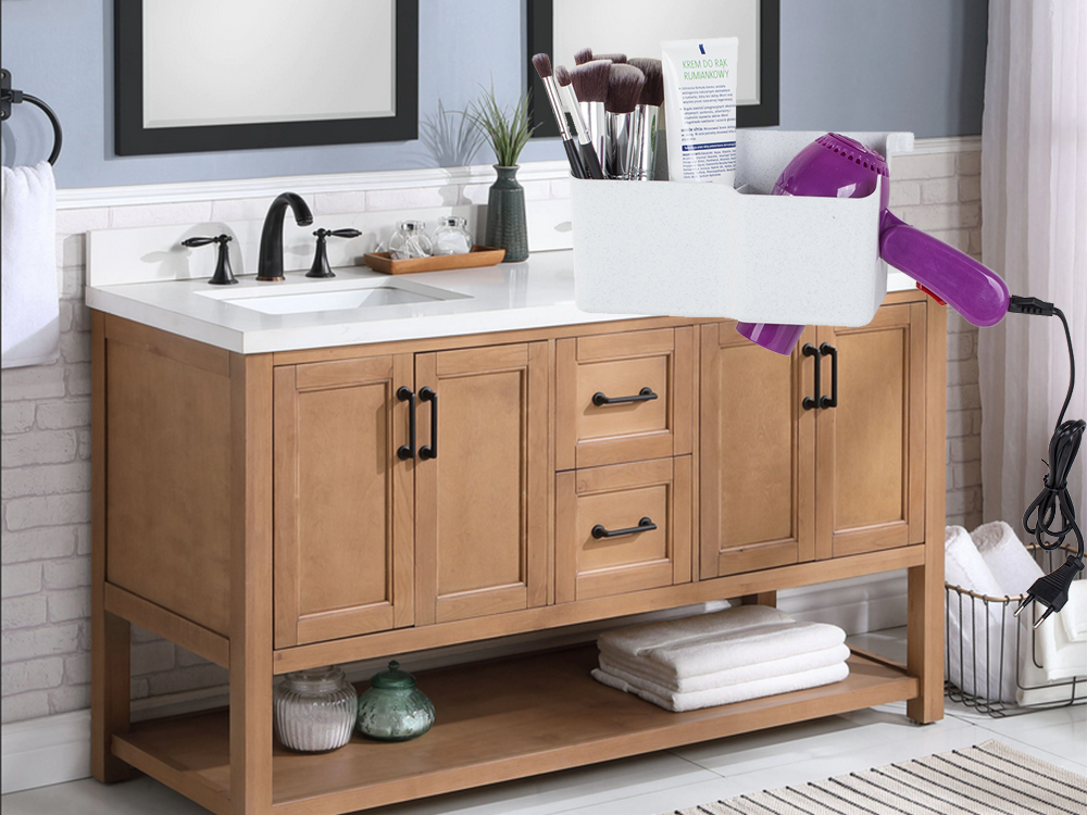 Наведите порядок в ванной комнате с помощью этого практичного настенного держателя для фена. Это идеальное решение для экономии места и удобного хранения аксессуаров для укладки волос. Органайзер оснащен специальным креплением для кабеля, тремя дополнительными отсеками для косметики или расчесок и двумя крючками для резинок или мочалки.