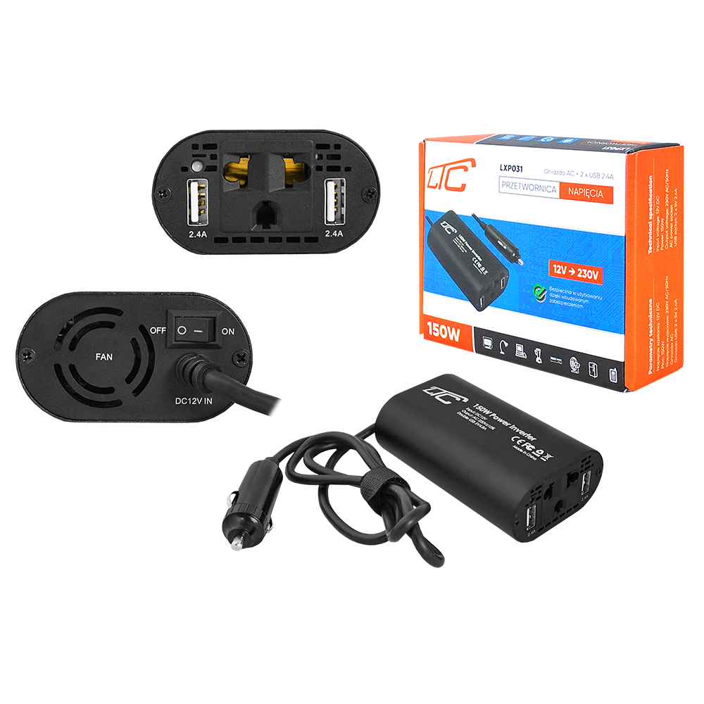 LTC Invertors, Automašīnas strāvas pārveidotājs no DC 12V uz AC 230V, 150W + 2xUSB 5V | Car Power Inverter