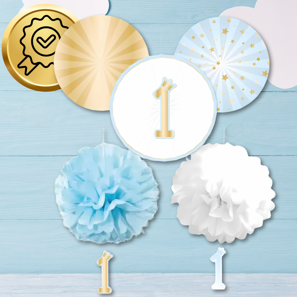 Šis dekorāciju komplekts puisīša pirmajai dzimšanas dienai ir ideāla izvēle, lai padarītu šo īpašo notikumu neaizmirstamu. Piecu elementu komplekts zilā, baltā un zelta krāsā radīs svinīgu un priecīgu atmosfēru jebkurās svinībās.
