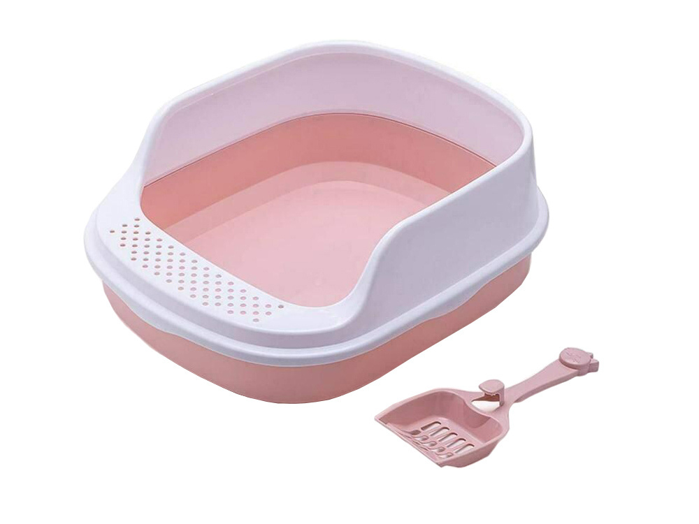 Atvērta kaķu tualete ar apmali un lāpstiņu, rozā