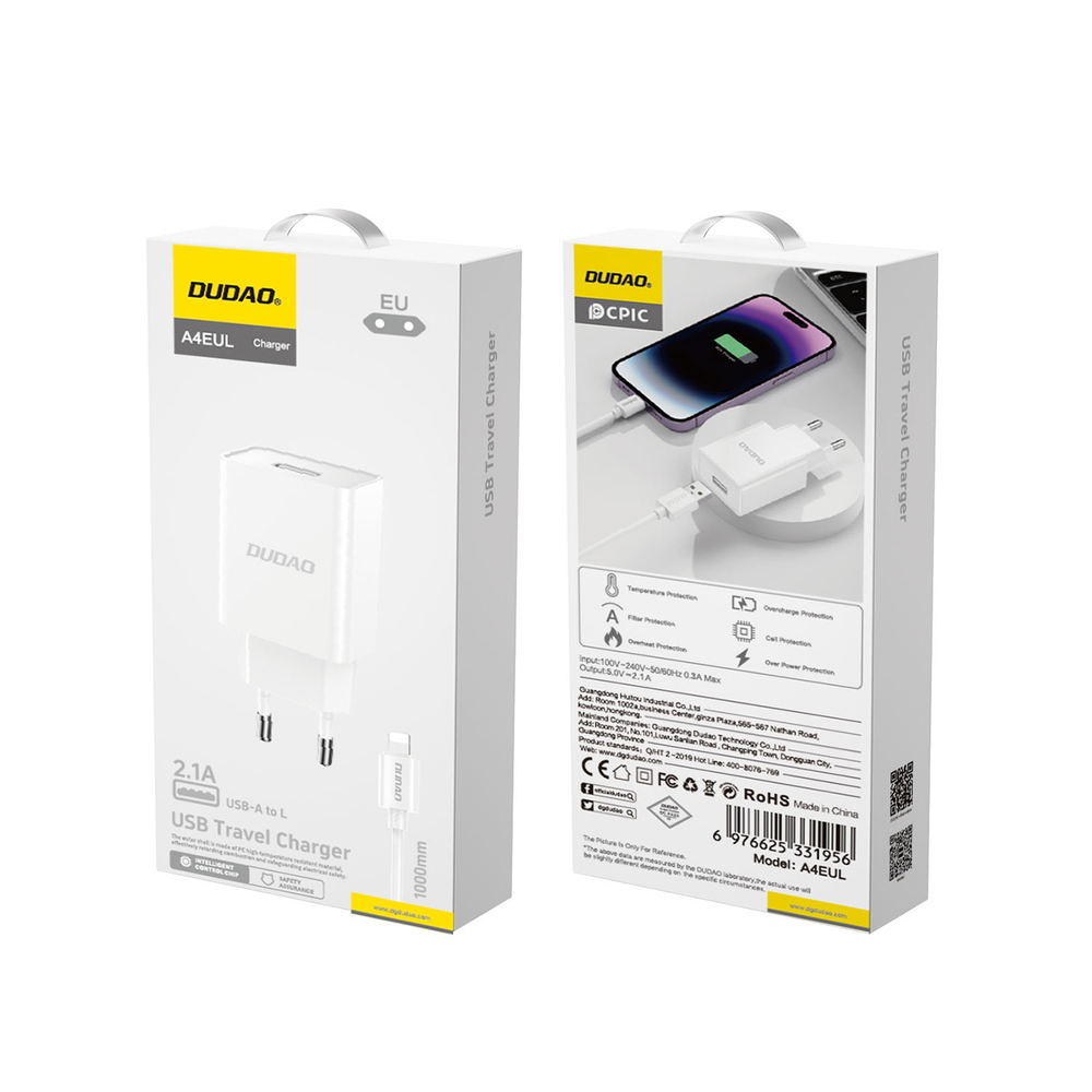 Dudao A4EU USB-A 2.1A sienas lādētājs – balts + USB-A – Lightning kabelis