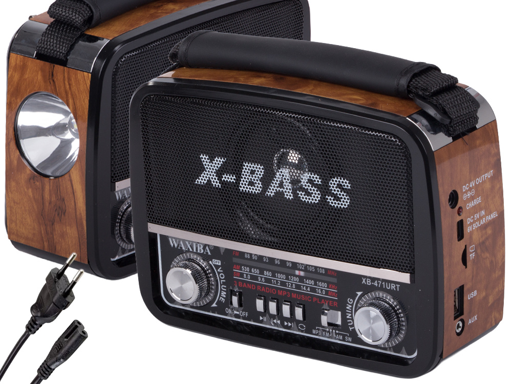 Atklājiet portatīvo retro radio WAXIBA XB-471URT. AM/FM/SW viļņi, MP3 atskaņotājs, USB, AUX, X-BASS un iebūvēts lukturītis mājai vai atpūtai dabā.